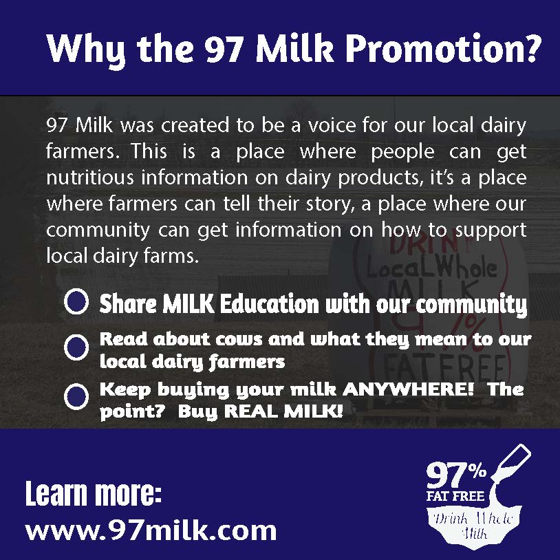 “97 Milk was created to be a voice for our local dairy farmers.” Says Jackie Behr, a volunteer board member in charge of the group’s marketing. “This is a place where people can get nutritious information on dairy products, it’s a place where farmers can tell their story, a place where our community can get information on how to support local dairy farms.”